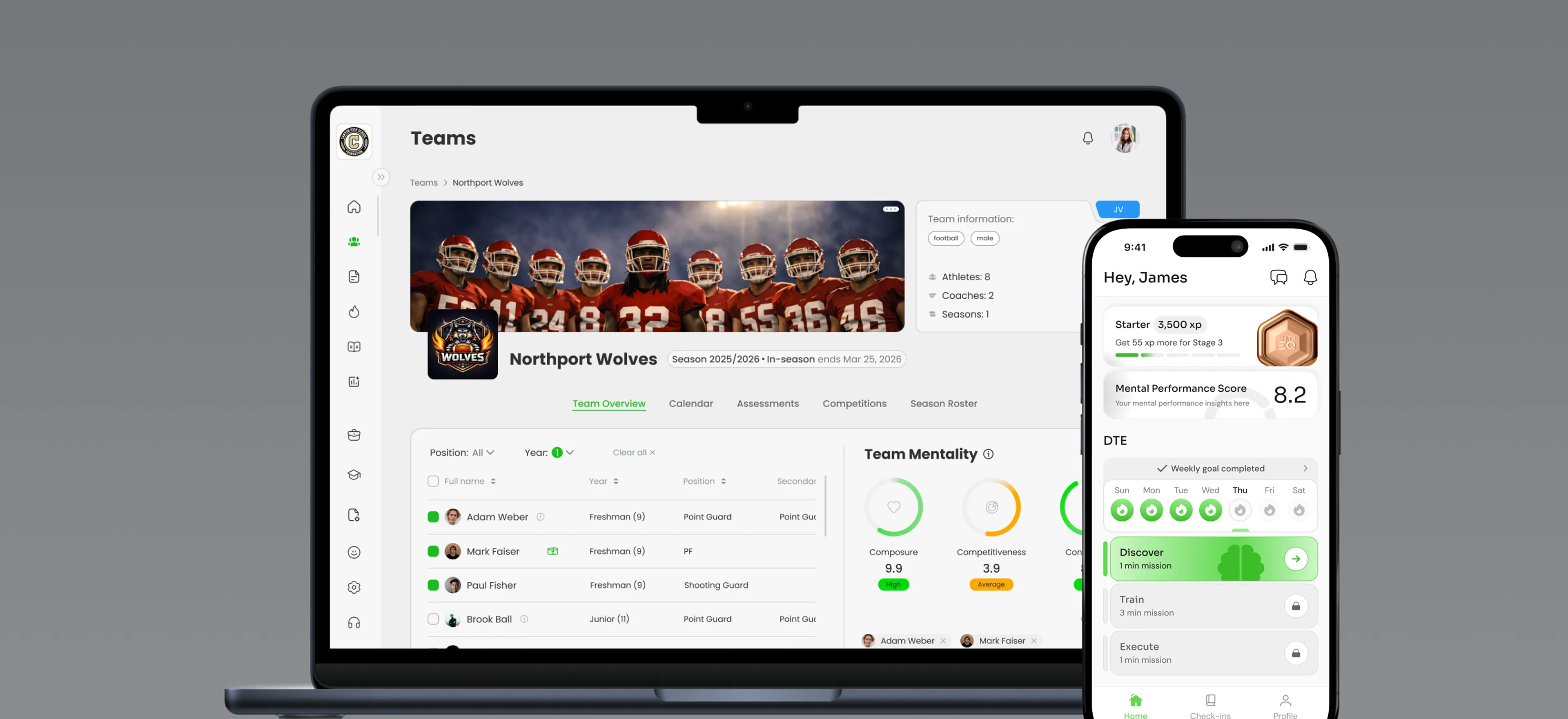 Personalized, mobile-first training with our DTE Framework (Discover, Train, Execute). Guided videos, exercises, and reflections keep athletes engaged and growing.